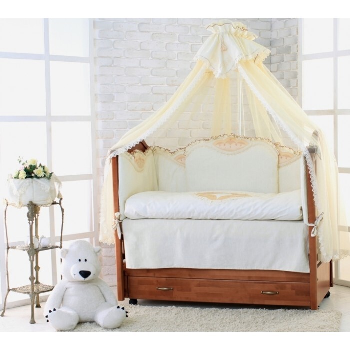 Это элитный детский комплект в кроватку, который изготавливается исключительно с высококачественного хлопка при строгом соблюдении норм экологического контроля.Хлопок - очень хорошо впитывает влагу, позволяет коже вашего малыша «дышать», приятный на ощупь.Деткое постельное белье выполненно в нежных цветах с декоративной вышивкой и кружевом.Кроватка Вашего малыша будет неотразимой и очень уютной.Комплект GreTa Lux "Марсель" 7 предметовВ комплекте:- балдахин – 6м- защита (4 части) – 125 х 63 см- пододеяльник Читать полностью