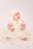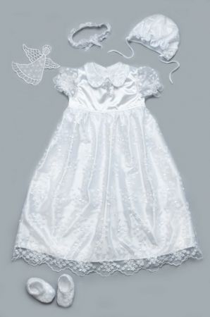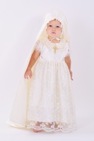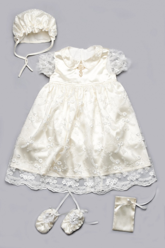 Набор для крещения девочки - платье, крыжма, пинетки, шапочка, мешочек для волос.В платьице Ваша малышка будет настоящей маленькой принцессой. Оно пошито из гипюра и атласа, и украшено вышивкой в виде православного крестика. Платье немного удлиненное, и создает впечатление красивого шлейфа с кружевным краем.Гипюровые прозрачные рукава-фонарики, и воротничок с закругленными краями, обрамленные вышивкой.Чепчик и пинетки замечательно дополняют ансамбль своей оригинальностью.Крыжма Читать полностью